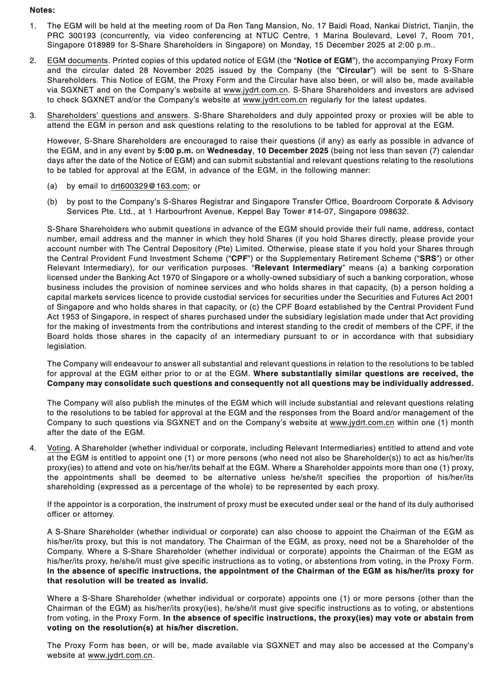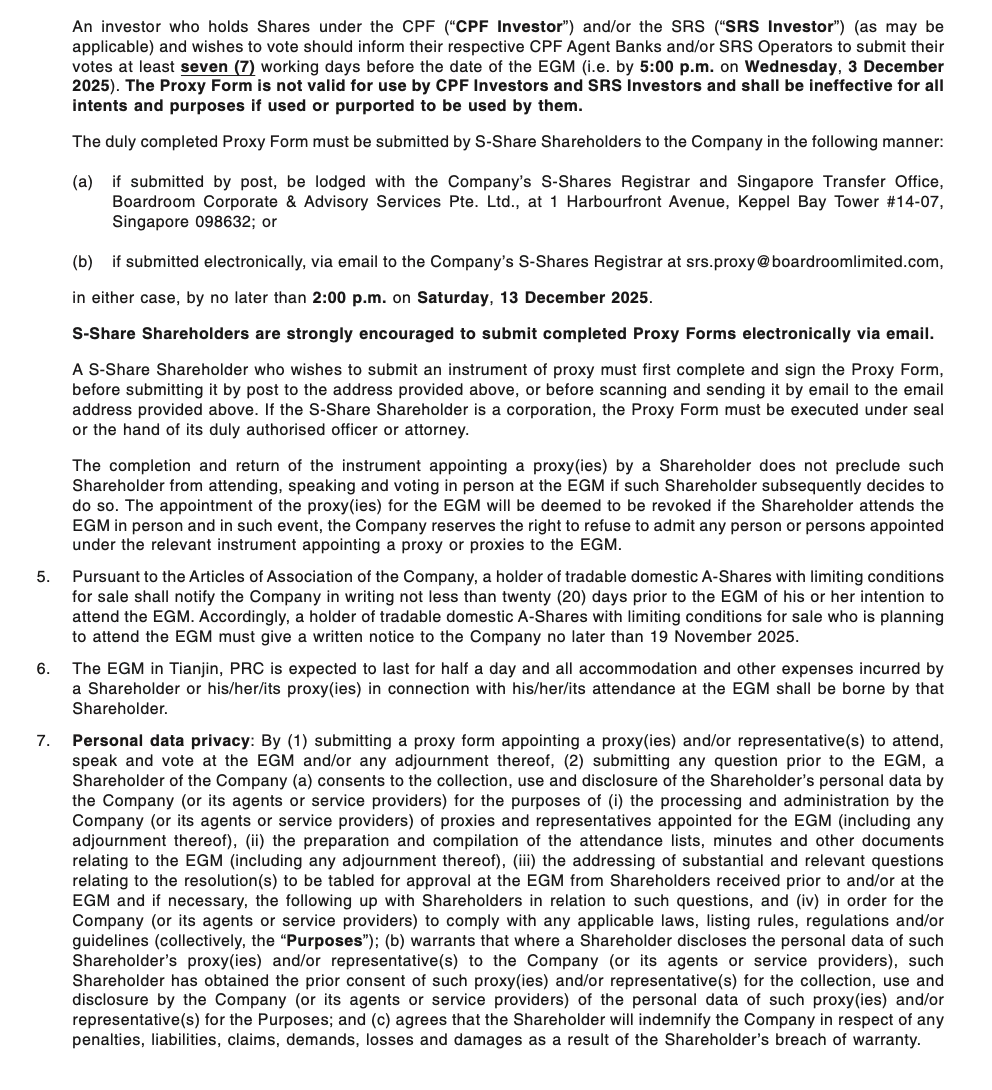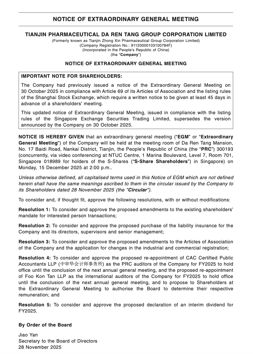 Tianjin Pharmaceutical DA REN TANG Group Corporation Limited circular dated 28 November 2025